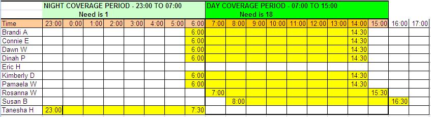 The Day coverage period runs from 07:00 top 15:00. There is a need for 18 employees.