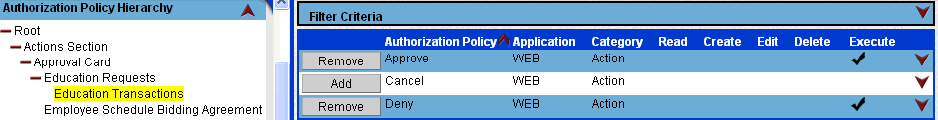 In order to access a specific screen, the user must grant access to each of the levels above the selected screen. In the example below, the users are first given access to the Action Section, then the Approval Card, then Education Requests, and finally Education Transactions.