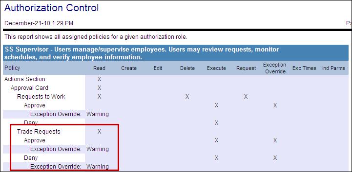 Run the Authorization Control report for the specified role to view the details, including the level of override allowed. Below is a screen print of the attributes of the SS Supervisor role.