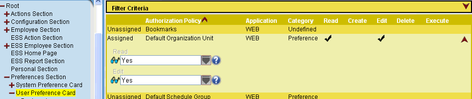 In order to access a specific screen, the user must grant access to each of the levels above the selected screen. In the example below, the users are first given access to the Preferences Section. The User Preferences Card is then available.