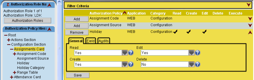 In order to access a specific screen, the user must grant access to each of the levels above the selected screen. In the example below, the users are first given access to the Configuration Section and then the Assignments Card. The Holiday screen is then available to set up by selecting the Add button to the left of the record.