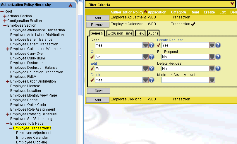 Depending on authorization roles, employees may be able to add, edit, and/or delete transactions without needing to have the transaction approved by a supervisor. This authorization is set in the related transaction screen under the Employee Section in the Authorization Policy Hierarchy tree.