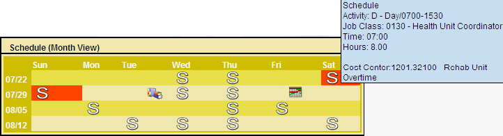 The Schedule (Month View) opens a calendar which displays the schedule for the employee for a four-week time frame, beginning with the date selected in the Pay Period drop down menu in the left pane. The icons indicate if the activity is for a schedule, a calendar, or an education tracking class. The red color-coding of a cell indicates that the schedule entry incurred overtime. Point to the icon with the cursor to display the details of the activity.