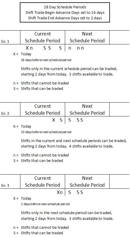 Shift Trade End Advance Days - The number of days before the scheduled shift to determine if it can be traded. Before this point, the shift can be traded; after this point, the shift cannot be traded.