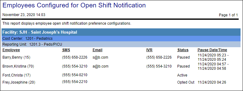 This report shows the employees that have and have not added their preferences for the two types of notifications: open shift notifications