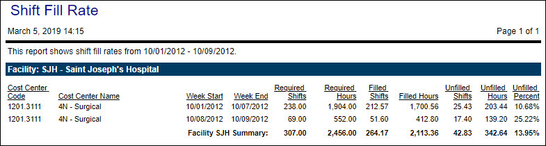 The report only displays data for organization units that have unfulfilled shifts at any point during the specified date range. If an organization unit is staffed to 100% or is overstaffed during the entire date range, it will not appear on the report.